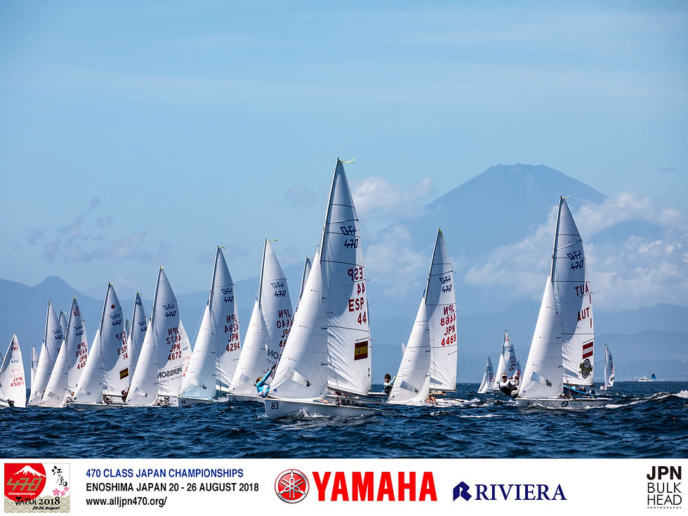 83艇が参加し神奈川県藤沢市の江の島ヨットハーバーを拠点に行われている、2018年 第47回全日本470級ヨット選手権大会 兼 第32回全日本女子470級ヨット選手権大会。レース日初日は南よりの風7〜8m/s、時折、台風余波が入るコンディションの中、2フリートに分かれた参加艇がそれぞれ3レースを行いました。